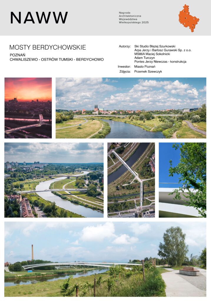 Nagroda za przybliżenie Poznania do rzek Warty i Cybiny, za udane spięcie Starego Miasta, Ostrowa Tumskiego i Berdychowa z kampusem Politechniki Poznańskiej, a także za harmonijne współgranie konstrukcji inżynierskiej z lapidarną, acz efektowną formą architektoniczną. Uznanie Kapituły budzi lekka forma kładek, zdająca się przeczyć grawitacji, a także szacunek dla zabytkowego kontekstu Ostrowa Tumskiego – kolebki państwa polskiego – okazany jednak bez poddaństwa. Współczesny charakter kładek i biel konstrukcji wyraźnie odcinają się od zielonego otoczenia, a zarazem – paradoksalnie – w nie wpisują. Mosty są jak bulwar zawieszony nad rzekami – oferują szerokie deptaki i trasy dla rowerzystów oraz niezakłócone widoki. Na uznanie zasługuje również aerodynamiczny detal pochwytu poręczy z ukrytym oświetleniem.