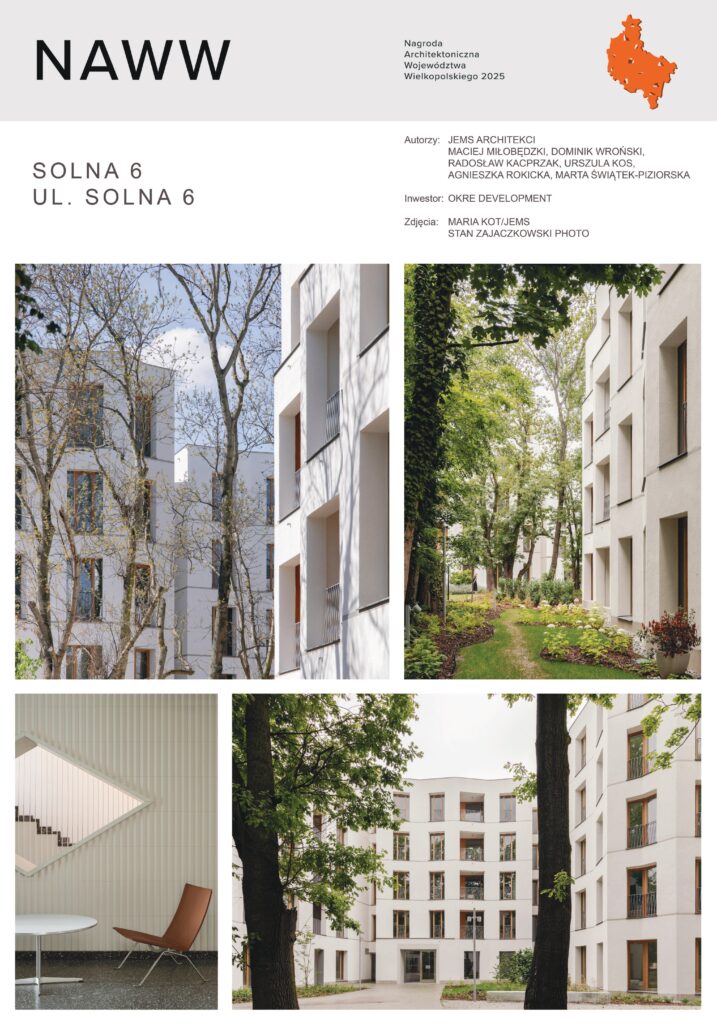Kapituła jednogłośnie uhonorowało zespół Solna 6 nagrodą główną w swojej kategorii oraz Grand Prix, w uznaniu za napisanie nowego rozdziału w historii poznańskiej i polskiej architektury mieszkaniowej. Zespół wielorodzinnych budynków projektu JEMS Architekci to połączenie mistrzowskiej wirtuozerii w budowaniu przestrzeni do życia z szerszym myśleniem o mieście. Powstał fragment wielkomiejskiej tkanki o własnej, rozpoznawalnej tożsamości, który zarazem – od momentu ukończenia – wydaje się istnieć w tym miejscu od zawsze.Nagroda przyznana została również za przywrócenie hierarchii ważności i gradacji przestrzeni publicznej, półpublicznej, półprywatnej i prywatnej, a także za doskonałe układy wysokich mieszkań, doświetlenie klatek schodowych, ekspresjonizm dopracowanych fasad oraz uważność na detal, który – choć w pełni autorski i oryginalny – zdaje się być echem najlepszych przedwojennych realizacji mieszkaniowych.