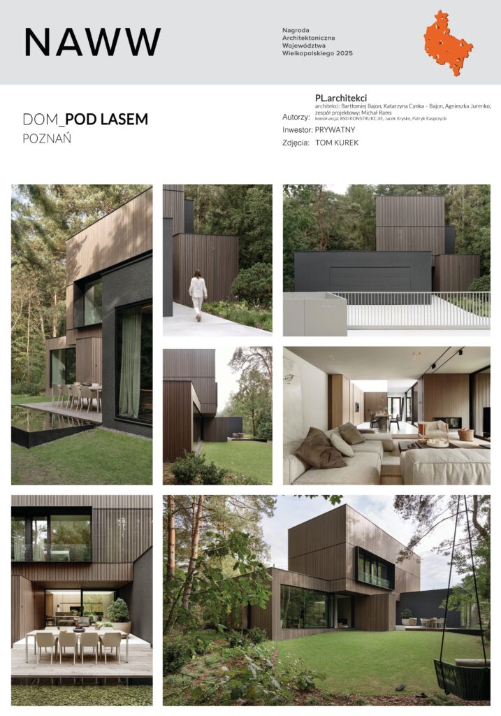 Wyróżnienie przyznano za olbrzymi kunszt, konsekwencję i dbałość o detal, które w tej realizacji współtworzą wyjątkowo spójną całość. Dom pod Lasem to przykład architektury precyzyjnej i pełnej świadomości – zarówno przestrzennej, jak i materialnej. Kapituła doceniła doskonałe rozwiązania funkcjonalne – umiejętne połączenie otwartej strefy dziennej z kuchnią i prywatnej części sypialnej na piętrze, a także świadome operowanie światłem i kadrami widokowymi. Pomimo niewielkiej działki i bliskości sąsiednich zabudowań, architektom udało się stworzyć wrażenie pełnej intymności – tak, jakby dom rzeczywiście stał w środku lasu. Na uznanie zasługuje również świetlik nad kuchnią, który subtelnie doświetla wnętrze i wzmacnia kontakt z otoczeniem, a także dbałość o każdy detal – od układu bryły po sposób, w jaki materiały współgrają ze światłem. To realizacja dopracowana w każdym calu, świadcząca o dojrzałości i mistrzostwie warsztatu autorów.