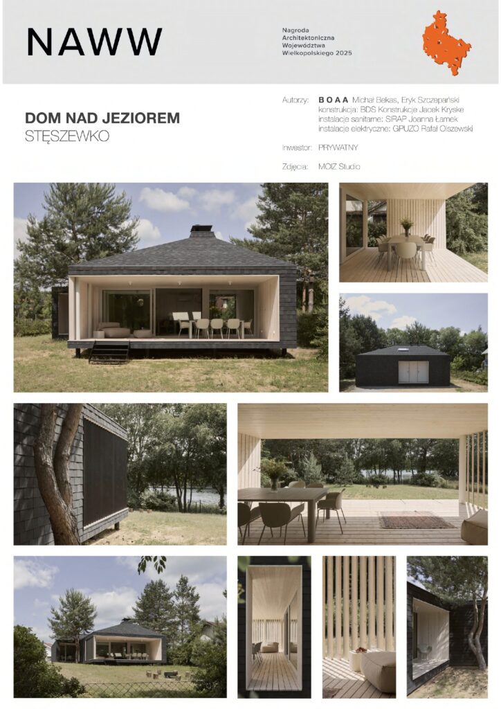 Kapituła Nagrody jednogłośnie nagrodziła w tej kategorii Dom nad jeziorem za dostępność rozegraną na wielu poziomach. Dom ma dostęp do jeziora, światła i zieleni, a zarazem jest dostępny pod względem ekonomicznym. Za jego architekturą stoi konsekwentnie zrealizowana, mocna idea – godząca oczekiwania mieszkańców, kontekst miejsca i skromny budżet – dzięki czemu nawet zastosowane tanie materiały z marketu budowlanego zyskują nowy wyraz. Nonszalancka skóra z bitumicznego gontu w czasie deszczu efektownie się srebrzy. Niewyszukanych materiałów jest tu więcej – nie rażą, lecz zyskują dzięki pracy architektów, umiejętnemu budowaniu przestrzeni oraz przemyślanemu połączeniu różnych faktur i kolorów. Dom jest szlachetny w swej prostocie, niczym dawne wiejskie chaty. W dobie „instagramowych” posiadłości na pokaz ta realizacja ujmuje swoją szczerością i może być wzorem – bo dostępny, stosunkowo niedrogi dom stał się tu prawdziwym dziełem architektury.