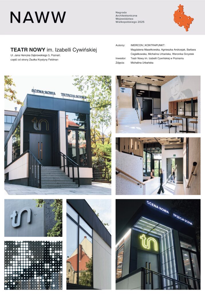 Wyróżnienie honorowe dla dzieła architektonicznego: Teatr Nowy im. Izabelli Cywińskiej w Poznaniu.