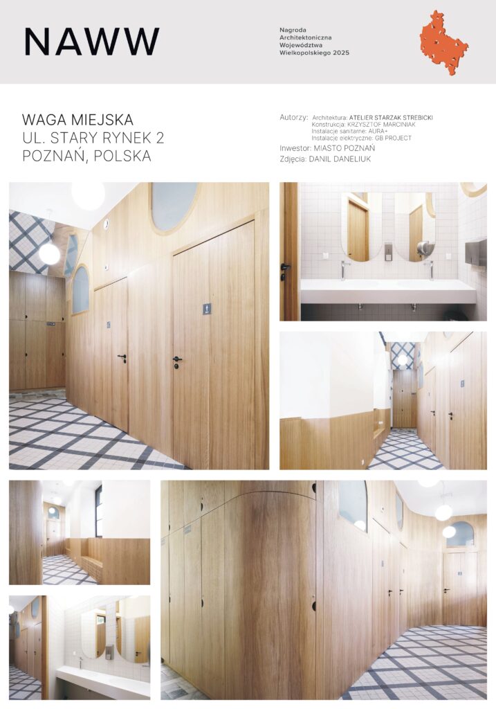 w zabytkowym budynku Wagi Miejskiej na Starym Rynku w Poznaniu. Mają one charakter lekkiego, wstawionego jakby tylko na chwilę mebla z forniru dębowego, co można odczytać jako znak, że architekci nie roszczą sobie prawa do trwałej aneksji wnętrz obiektu o wielowiekowej historii. Uznanie Kapituły wzbudziła zastosowana oszczędna kolorystyka i paleta materiałów oraz… subtelne poczucie humoru.
